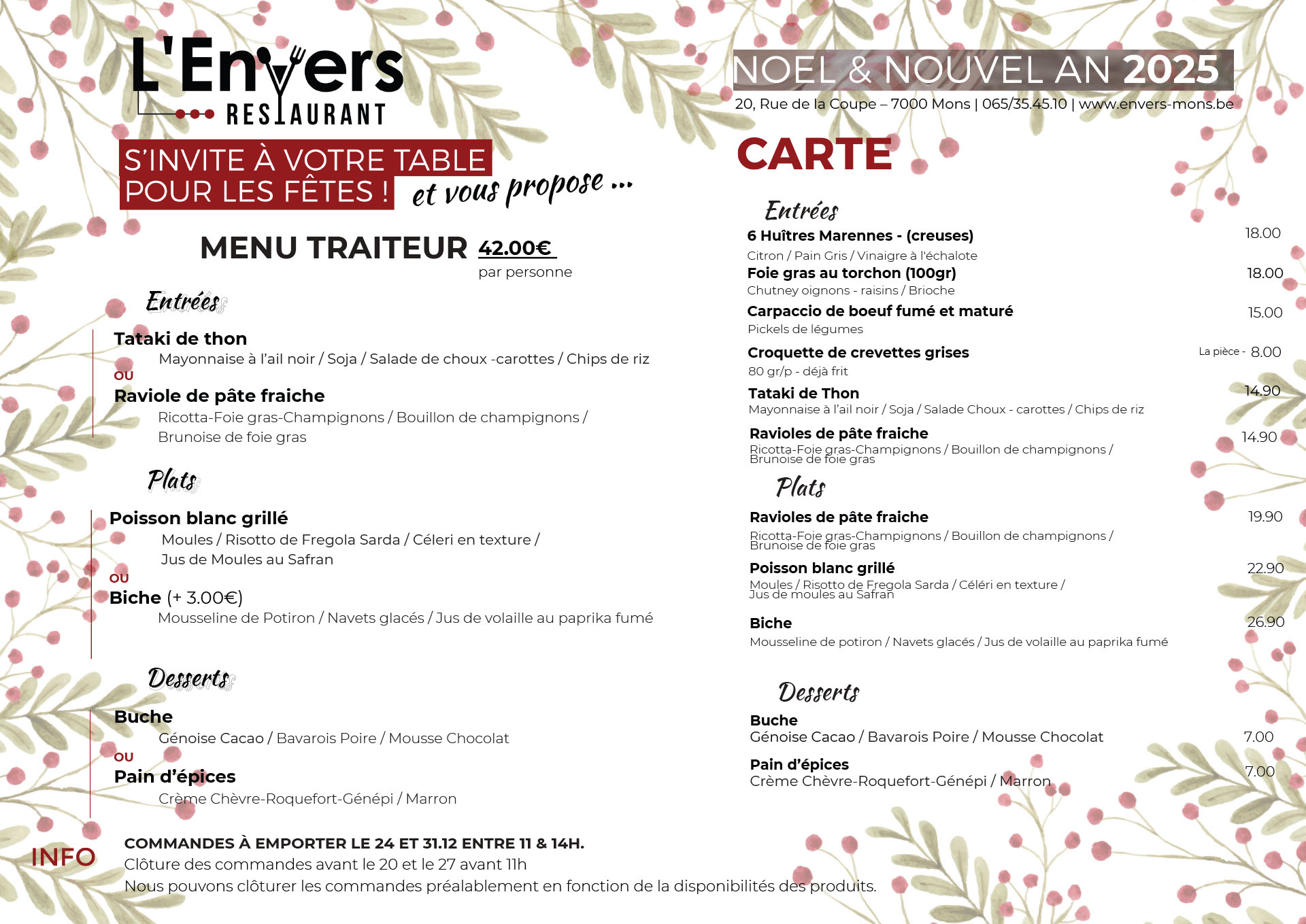 Commandes jusqu’au 20/12 (avant 11h00) pour la Noël et le 27/12 (avant 11h00) pour le Nouvel-An.